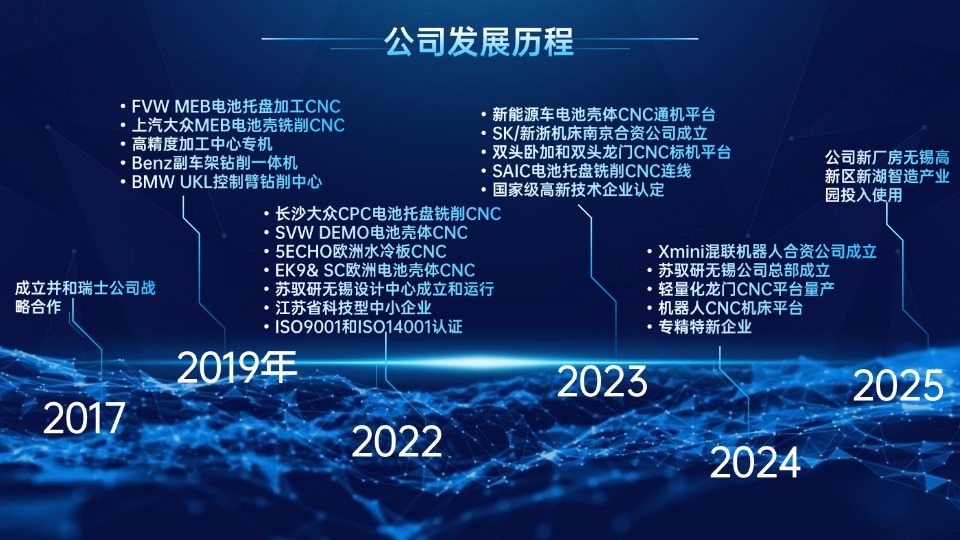苏驭研公司是集设计、研发、生产、销售和服务为一体的高效率与高精密数控加工中心机床和机器人组合机床的专业制造商,设备产品广泛应用于新能源汽车制造、航空航天、精密模具、电子半导体等行业。公司以技术创新为核心驱动力,通过持续投入研发和产学研合作,致力于高品质数控加工和机器人技术的革新与产业化。公司已通过ISO9001质量体系和ISO14001环境管理体系认证及多项行业资质,并与国内外知名高校、科研机构建立战略合作,为客户提供标准化或定制化加工解决方案。