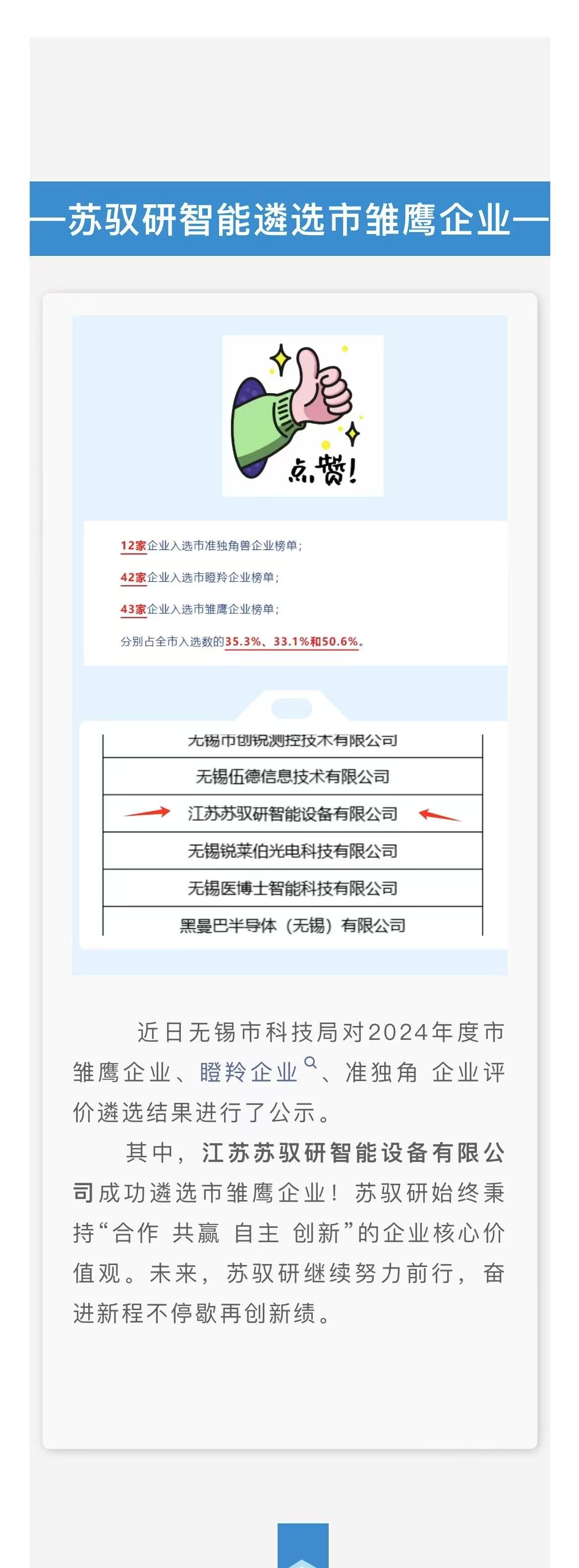 热烈庆祝苏驭研智能遴选市雏鹰企业